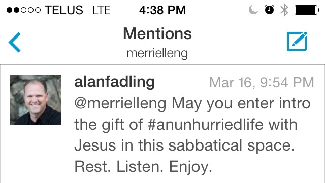 Before my sabbatical, I bought Alan Fadling’s book: An Unhurried Life: Following Jesus’ Rhythms of Work and Rest and received an introductory coaching word…